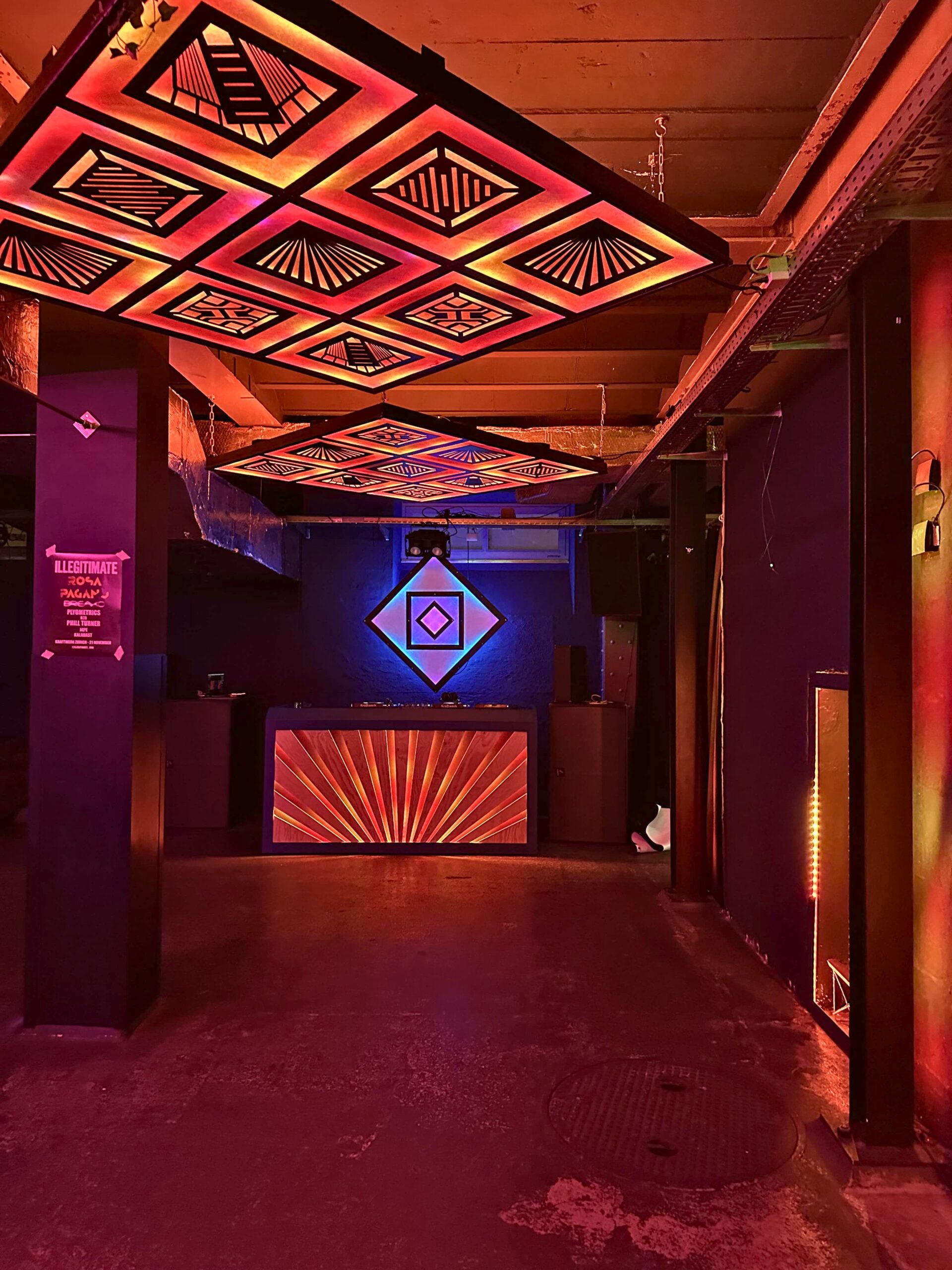 Ein urbaner, intimer Eventraum mit Club-Charakter: dunkle Wände, warme Lichtnischen und farbiges LED-Ambiente schaffen eine stimmungsvolle Umgebung. Teppiche, Loungesofas und Poufs verleihen dem Raum eine gemütliche Note, während die Diskokugel und Lichtprojektionen für Party-Vibes sorgen. Der Raum ist ideal für Veranstaltungen, die eine Mischung aus Wohnzimmer-Gemütlichkeit und Nightlife-Energie suchen.